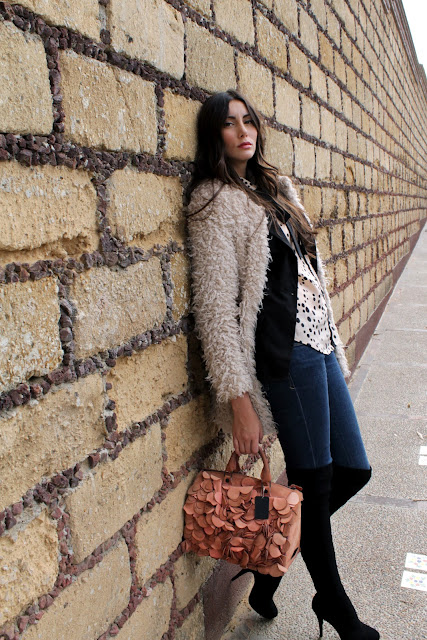 Since, fur, faux fur has become so on-trend, there are lots of faux furs floating around in the stores. So I chose this one, to wear it with my favorite pair of jeans and my over the knee black boots! adding a feminine/vintage touch with the blush polka dotted shirt.